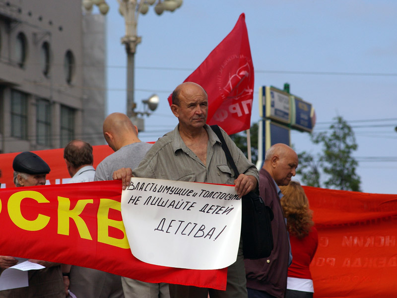 Любому желающему выступить по вопросам детского образования и воспитания предоставлялось слово на свободной трибуне. В центре митинга была развернута растяжка: "Защитим детей - спасем Россию!". Около нее в цепочку выстроились школьники в атрибутике КПРФ и боксерских перчатках. Они представляли детскую секцию, которую опекает КПРФ. Напомнив о детских кружках в СССР, молодые боксеры принялись энергично изображать поединки прямо перед митингующими. Старшее поколение подбадривало их криками "Молодец!"