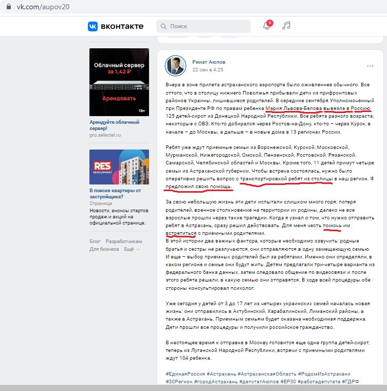 Но как бы в этой неразберихе не позабыли о соучастниках похищения украинских детей. В частности, я имею в виду Аюпова Рината Зайдулаевича, который не раз сознавался в содеянном на своей странице в ВК. Это не считая оказания помощи незаконным бандформированиям на территории Донецкой и Луганской областей. Возможно, данная информация поможет следствию установить, куда были похищены украинские дети. Дети или часть детей были угнаны на территорию Астраханской области при участии деятеля партии "Единая Россия" Рината Аюпова.