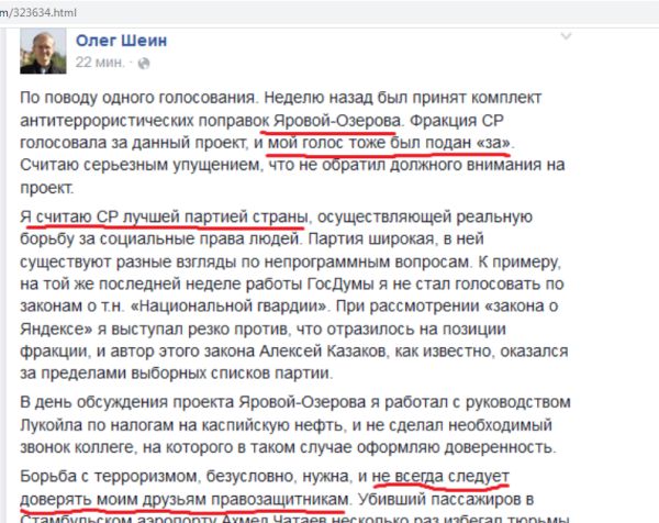 В этом же созыве Олег Шеин проголосовал за тот самый пакет Яровой, после которого пошло наступление на свободный интернет. Желающие могут проверить, как голосовал депутат, на сайте Госдумы.