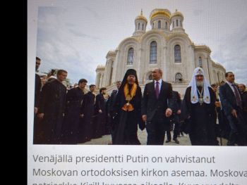 В Финляндии у меня родился внук, который уже давно окончил школу. Я видел его учебники. Поражает учебник по религии, где написано, что даже самые уважаемые люди планеты верят в бога и молятся. Фотографию из учебника с Путиным и Медведевым я приложу. Внук изучал русский язык по учебнику, написанному тоже "странными" людьми, где тоже достаточно подобных моментов.